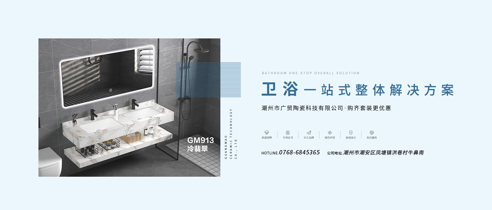潮州市廣貿陶瓷科技有限公司是一家集研發、生產、銷售、服務于一體的現代化衛浴企業,主要產品為龍頭、花灑、座便器、浴室柜、水箱等,公司在用戶信賴及各界人士的關心支持下,經過幾年的創業拼搏,現擁有一支高素質的管理、營銷團隊和一批杰出的技術人才,并在國內的各大、中型城市設立了分銷商及辦事處。品質質量和真誠完善的服務使本公司在廣大合作伙伴中享有價高的產品質量信譽。